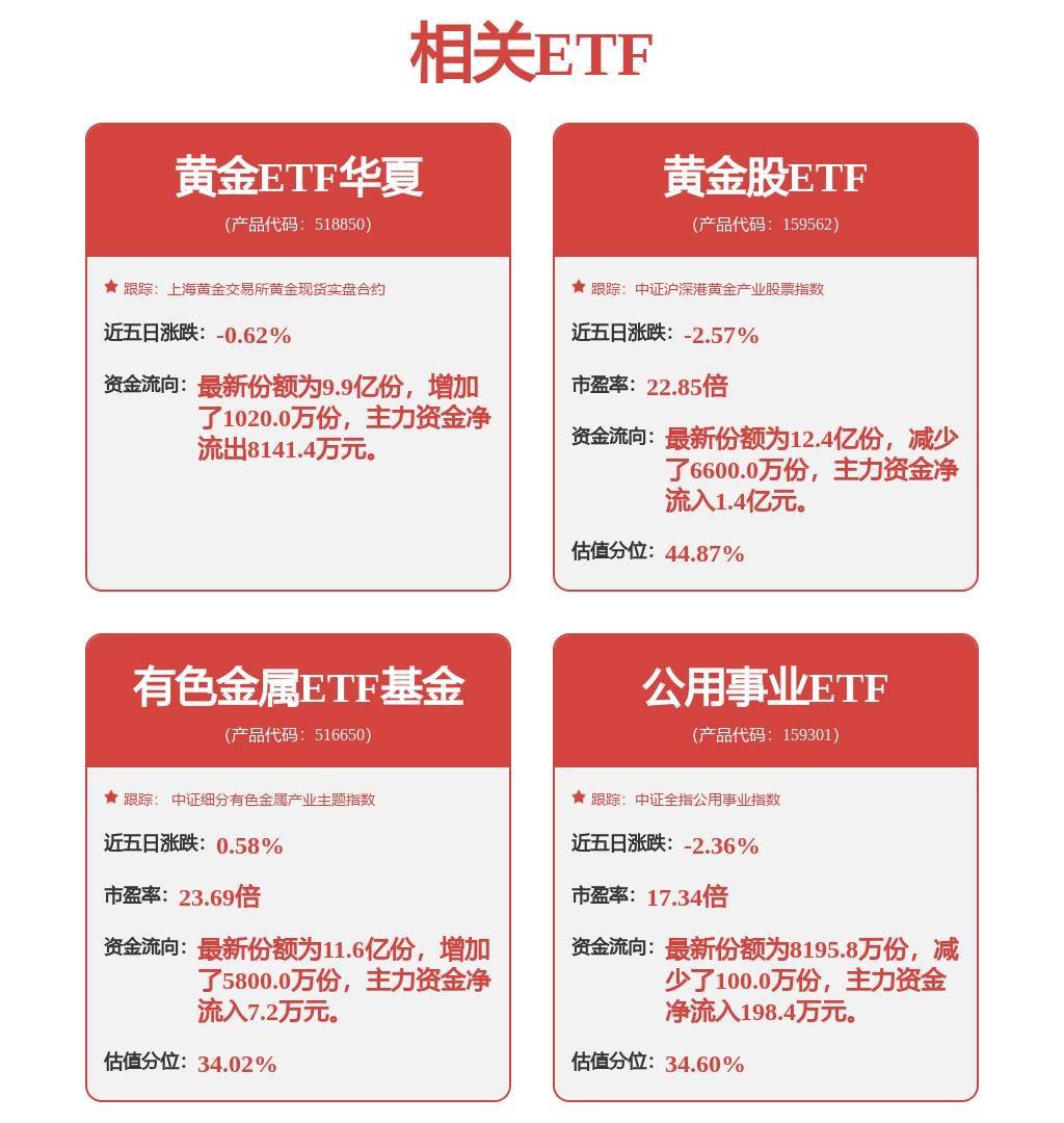 11月18日交易鑫优配,金价震荡下跌,COMEX黄金期货价格跌破4020美元关口,黄金相关ETF纷纷回调,截至14:05,黄金ETF华夏(518850)跌1.04%,有色金属ETF基金(516650)跌3.23%,黄金股ETF(159562)跌2.5%。